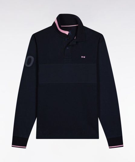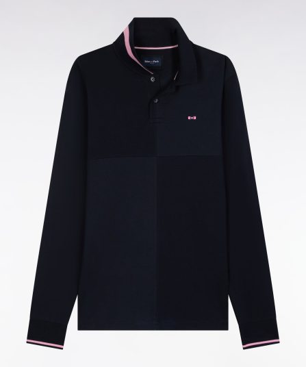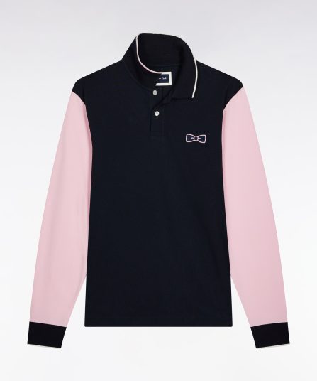 Polo à manches longues bicolore marine et rose à nœud papillon