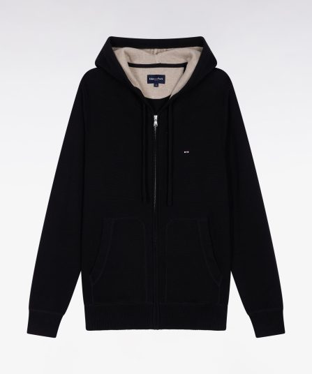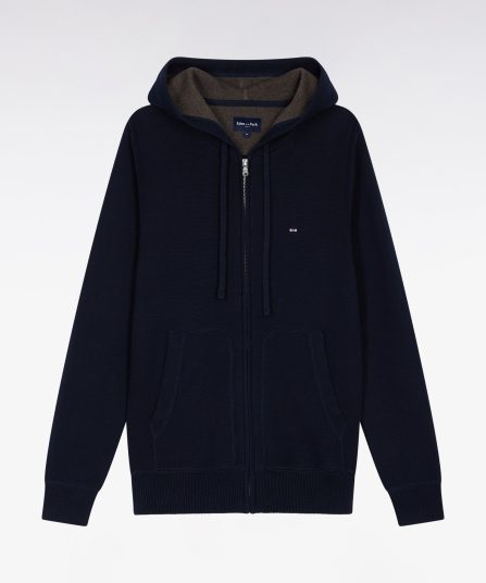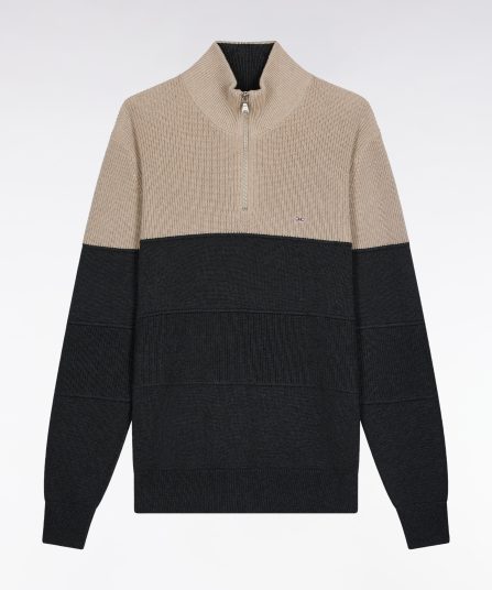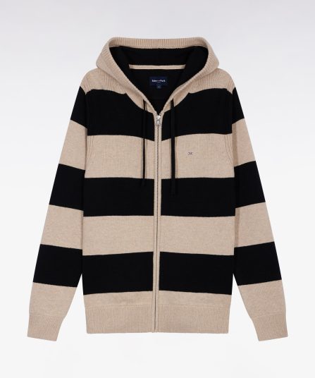 Pull à capuche zippé en laine et coton rayé marine et beige coupe droite