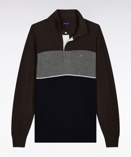 Polo tricolore à manches longues en coton stretch marron coupe slim