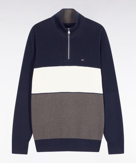 Pull à col maillot en laine et coton à rayures rugby marine et blanc coupe Relaxed