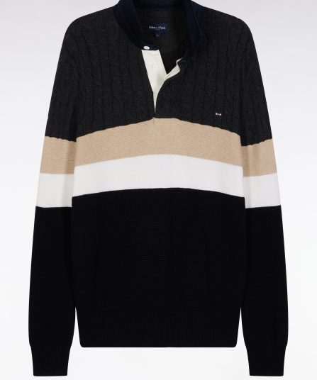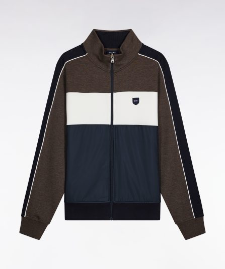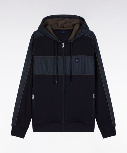 Sweatshirt zippé à capuche en molleton et nylon marine et beige