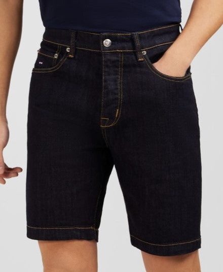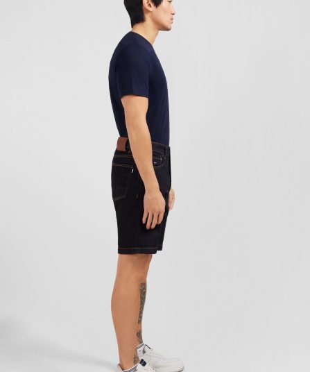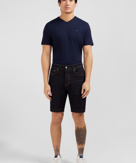 Ce bermuda en jean affiche un beau coloris brut, mis en valeur par des surpiqûres contrastées. On note le logo brodé en forme d’écusson au niveau de la poche ticket