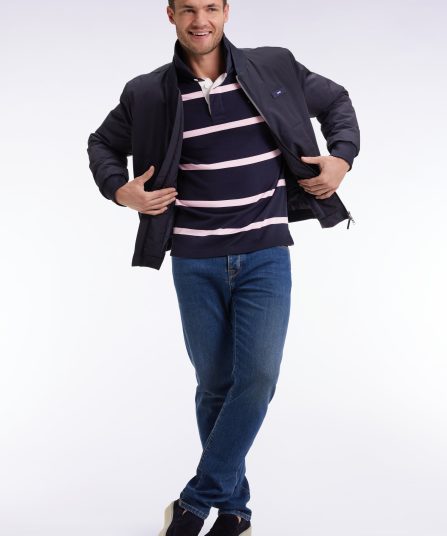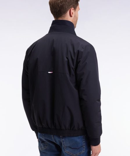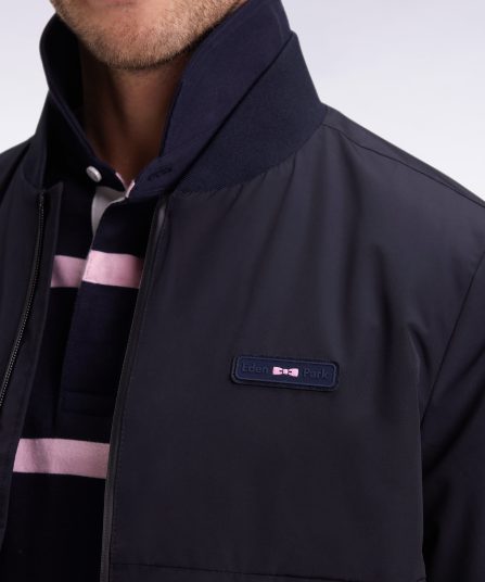 Élégance sportive et détails techniques pour ce blouson Starter marine en nylon doublé de nylon ouatiné. Le jeu de découpes sur le devant et le dos structure la silhouette, tandis que les finitions soignées : zip Aquagard, poches zippées passepoilées et bords-côtes en soulignent le caractère. L’inimitable touche Eden Park ? Un ruban tricolore subtilement glissé sous l’encolure et sa barrette logo en gomme !