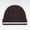 Confectionné dans une maille chaude et moelleuse mêlant la laine et le coton, ce bonnet torsadé marron s’impose comme un essentiel masculin de saison. Son revers contrasté marine et écru apporte une touche graphique, tandis que l’écusson nœud papillon rose brodé signe discrètement cet accessoire sport-chic. À associer avec l’écharpe assortie pour un look hivernal coordonné