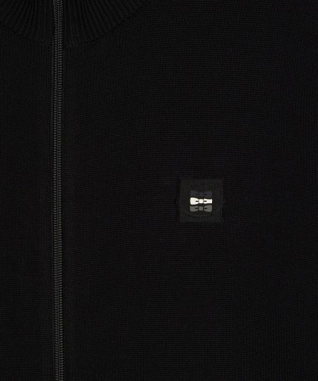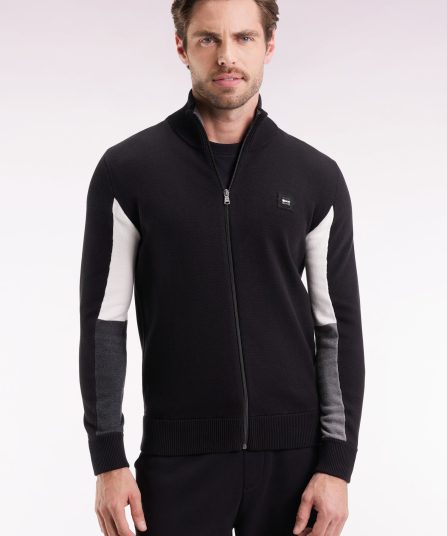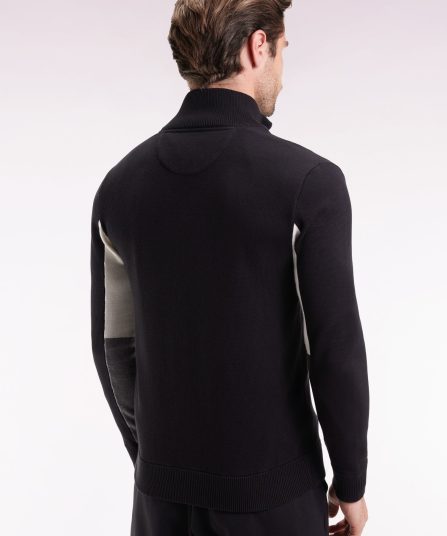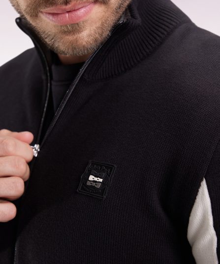 Ce cardigan zippé à col montant séduit par son jeu de coloris. Le corps en jersey contraste subtilement avec l’intérieur des manches remaillé dans des coloris différents. Pensé pour allier confort et allure sport-chic, ce pull col camionneur est signé par un badge en feutre et silicone sur la poitrine