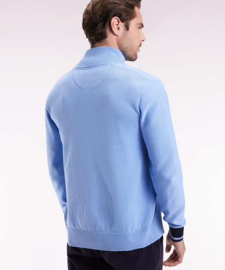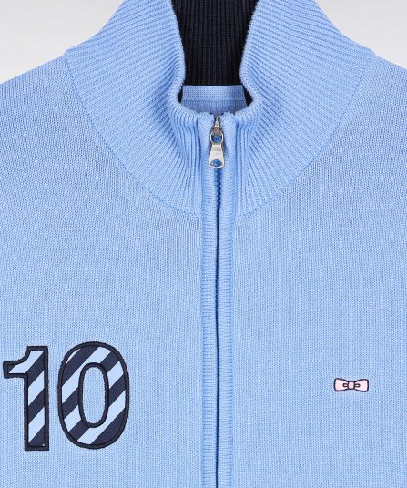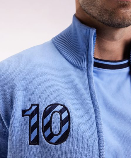 Ce cardigan zippé à col montant affirme son caractère sport-chic à travers ses jeux de textures entre point jersey et jersey envers. Ses bords-côtes manches et sa broderie 10 rehaussée d’une application de tissu cravate apporte une touche graphique discrète. Une pièce confortable et soignée, pensée pour rythmer les silhouettes du quotidien