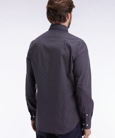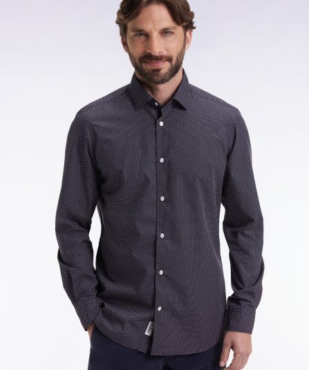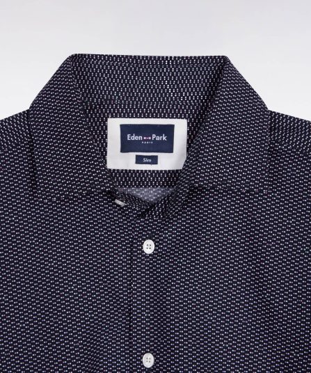 Avec son imprimé micro-pois discret rose ou bleu sur un fond marine, cette chemise à la coupe slim seyante affiche une allure moderne tout en respectant les codes de l’élégance Eden Park. Réalisée dans une popeline de coton douce et respirante, elle se distingue par l’absence de poche poitrine et par la broderie nœud papillon en bas de pièce, clin d’œil minimaliste à l’univers French Flair de la maison