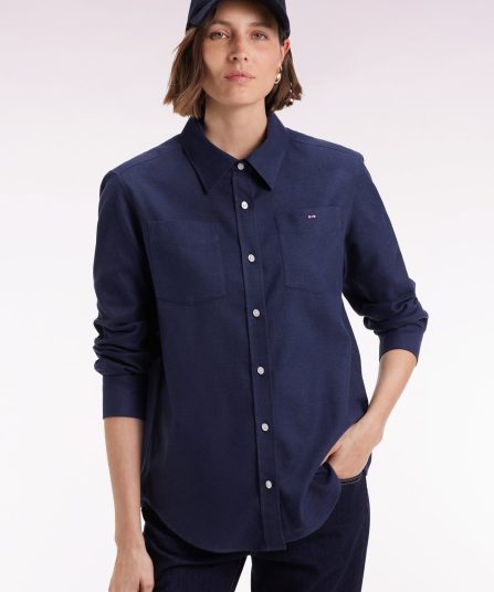 Cette chemise femme en popeline de coton marine ou écru adopte une coupe Relaxed légèrement ample et deux poches plaquées pour une allure résolument contemporaine. Une pièce intemporelle facile à mixer à votre vestiaire, entre chic épuré et décontraction maîtrisée