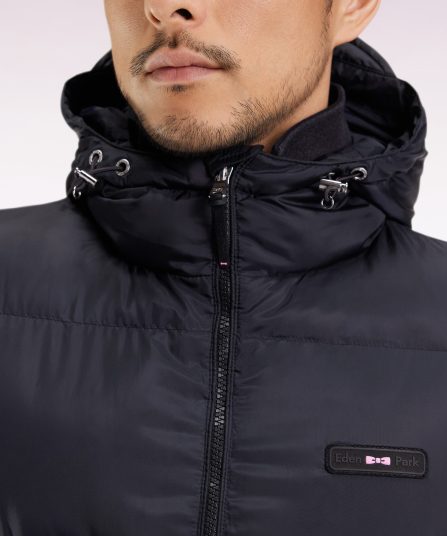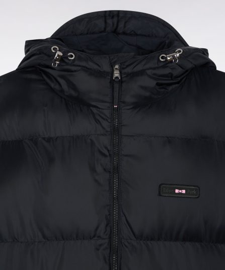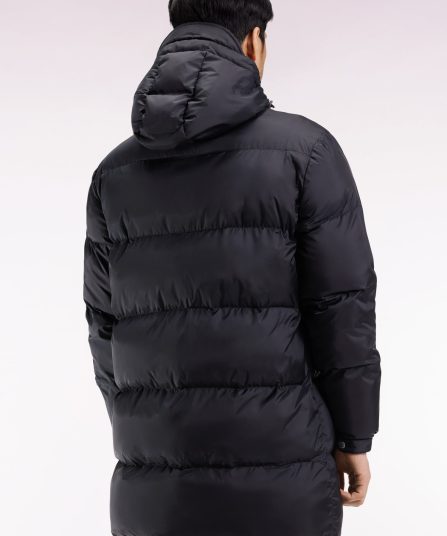 Pensée par notre studio de création pour affronter l’hiver avec style, cette doudoune longue à capuche intégrée séduit par son volume généreux et son matelassage large au fini subtilement brillant. Déclinée en noir ou en marine, cette doudoune homme allie protection et élégance avec ses zips en métal argenté, ses poignets élastiqués à patte pressionnée et ses finitions emblématiques : ruban tricolore sous l’encolure et barrette logo en gomme sur la poitrine