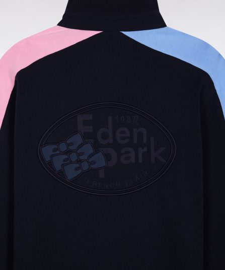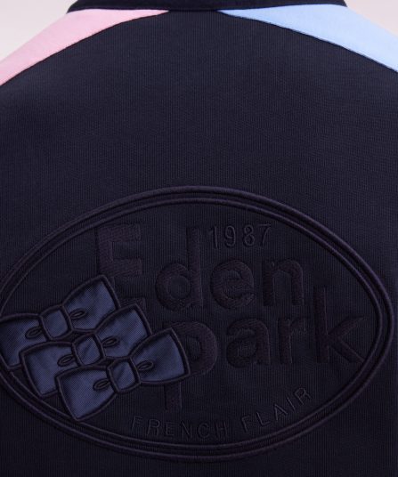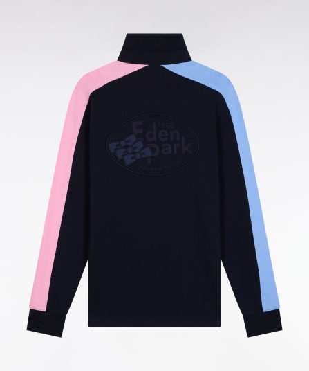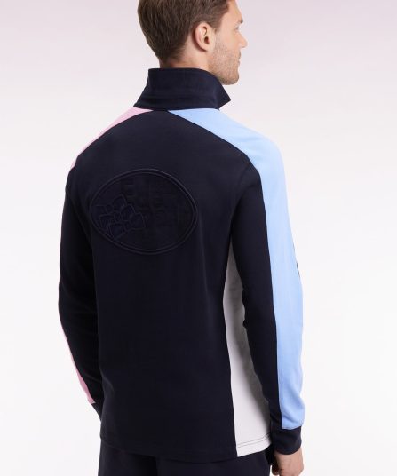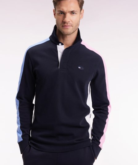 Ce maillot à manches longues en jersey épais se distingue par ses découpes contrastées aux manches et sa broderie dans le dos, rehaussée d’incrustations de tissu cravate ton sur ton pour une allure sportive maitrisée. Le col en twill présente un dessous en maille plate, tandis que les poignets en bord-côtes assurent un ajustement confortable. Une pièce sport-chic essentielle alliant style et détails rugby soignés comme sa plaquette de boutonnage contrastée et ses boutons inspirés de l’ovalie