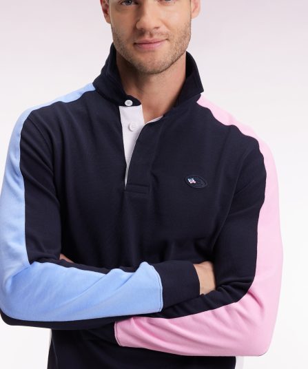 Ce maillot à manches longues en jersey épais se distingue par ses découpes contrastées aux manches et sa broderie dans le dos, rehaussée d’incrustations de tissu cravate ton sur ton pour une allure sportive maitrisée. Le col en twill présente un dessous en maille plate, tandis que les poignets en bord-côtes assurent un ajustement confortable. Une pièce sport-chic essentielle alliant style et détails rugby soignés comme sa plaquette de boutonnage contrastée et ses boutons inspirés de l’ovalie