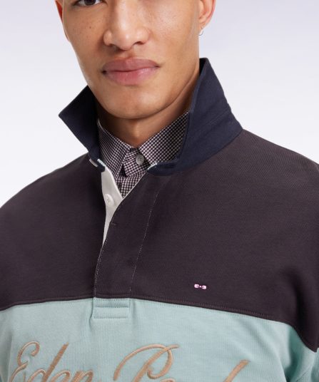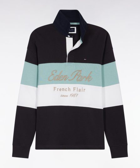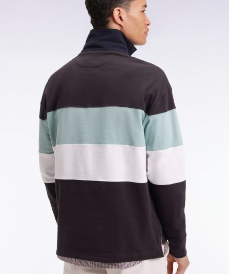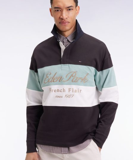 Clin d’œil au style preppy des campus anglo-saxons, ce maillot de rugby à manches longues en jersey de coton épais mixe rayures emblématiques et broderie vintage sur le devant. Un modèle à l’allure sport-chic assumée, twistée par un col en twill contrasté et des finitions en ruban chevron à l’intérieur