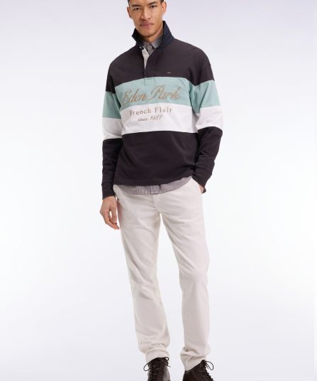 Clin d’œil au style preppy des campus anglo-saxons, ce maillot de rugby à manches longues en jersey de coton épais mixe rayures emblématiques et broderie vintage sur le devant. Un modèle à l’allure sport-chic assumée, twistée par un col en twill contrasté et des finitions en ruban chevron à l’intérieur