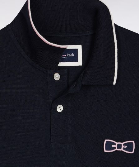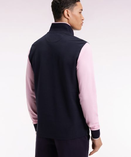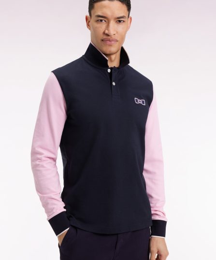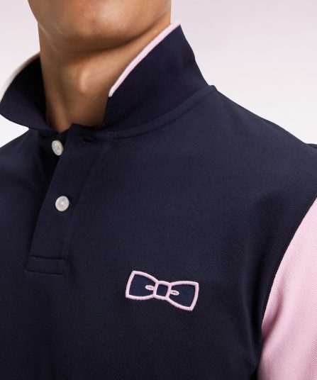 Polo à manches longues bicolore marine et rose à nœud papillon