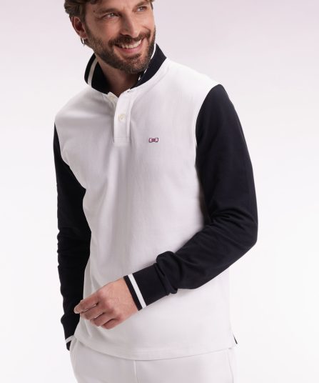 En coloris ciel, rose ou blanc à manches longues noires, ce polo masculin apporte une note de contraste aux tenues les plus simples. Réalisé dans un piqué de coton doux et résistant, il arbore une coupe droite promesse de confort. Un essentiel comportant sur la manche la broderie 10, code propre à notre maison rehaussé par un tissu cravate à rayures rugby. Le soin apporté aux finitions de ce polo reflète notre exigence en matière de style et de qualité.