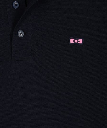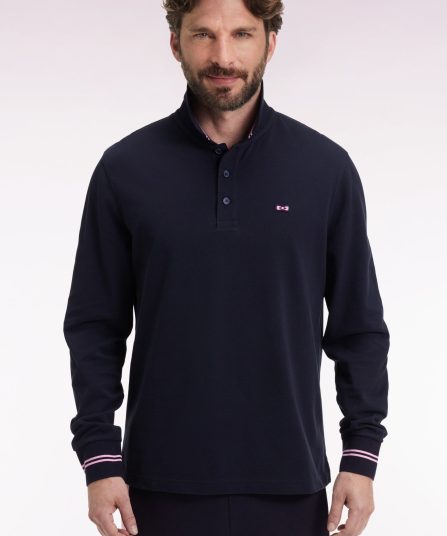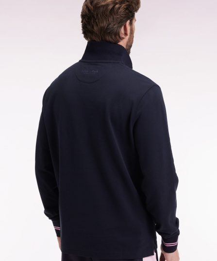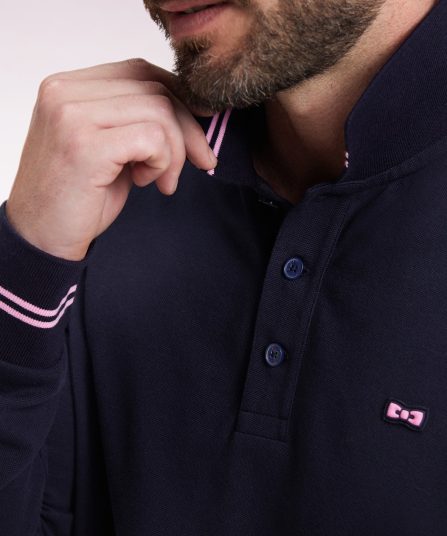 Simplement rehaussé d’un dessous de col à rayures rugby roses, dont les poignets bords-côtes offrent un rappel subtil, ce polo manches longues marine est un pilier de l’élégance sportive. Détail original, son emblème nœud papillon est travaillé dans une version en gomme silicone pour une note moderne plus athlétique