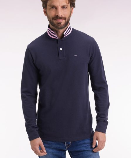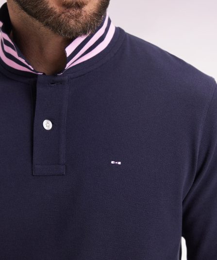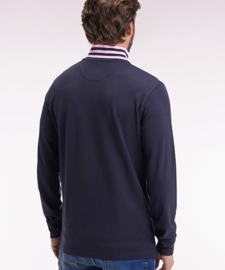 Ce polo à manches longues en piqué de coton uni se distingue par ses finitions soignées emblématiques de l’esprit French Flair de la Maison. Le dessous de col est cerclé de rayures rugby iconiques, tandis que le revers de la patte de boutonnage révèle un contraste discret mais affirmé. Décliné dans trois coloris signature