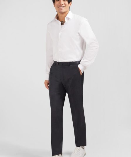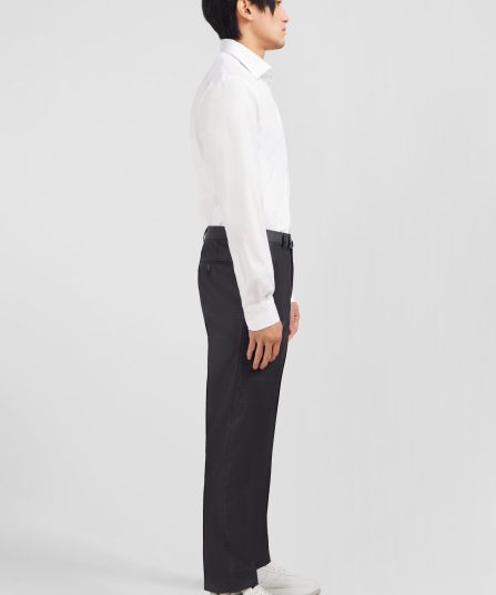 Conçu en laine fine, ce pantalon est élégant à souhait avec sa coupe droite et ses jambes à plis cassés. Il dispose d’une taille ajustable grâce à sa patte boutonnée et des passants pour ceinture. Fonctionel, le pantalon possède des poches italiennes, une poche ticket prise dans la couture sous la taille, ainsi que deux poches passepoilées et boutonnées au dos.