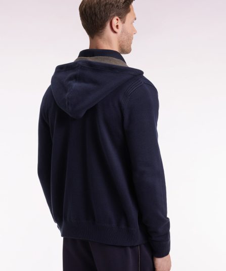 Pensé comme une alternative chic au sweatshirt, ce pull à capuche en coton tricoté joue la carte du confort et du style sport-chic. Le corps en jersey s’accompagne d’une doublure contrastée marron ou beige à l’intérieur de la capuche, tandis que les emmanchures diminuées et les finitions en bord-côtes apportent structure et tenue à ce modèle masculin aussi tendance qu’intemporel. Les poches kangourou et les cordons de serrage tricotés complètent cette pièce, parfait pour une allure décontractée et maîtrisée au quotidien. La rencontre parfaite entre la douceur de la maille et l’attitude cool d’un sweatshirt