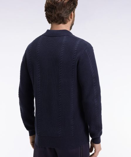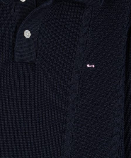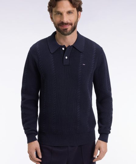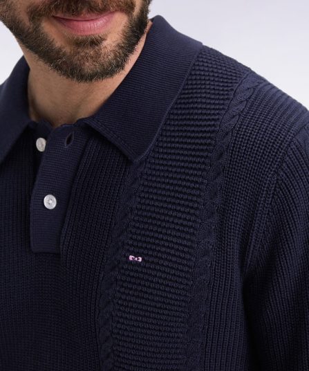 Ce pull à col polo vous propose une allure rétro twistée avec élégance par son col marine contrasté et sa patte de boutonnage travaillée en point milano. Le corps s’anime de torsades placées et de jeux de tricotage emblématiques du savoir-faire des ateliers Eden Park. Idéal pour une silhouette graphique et sophistiquée du matin au soir à la saison froide