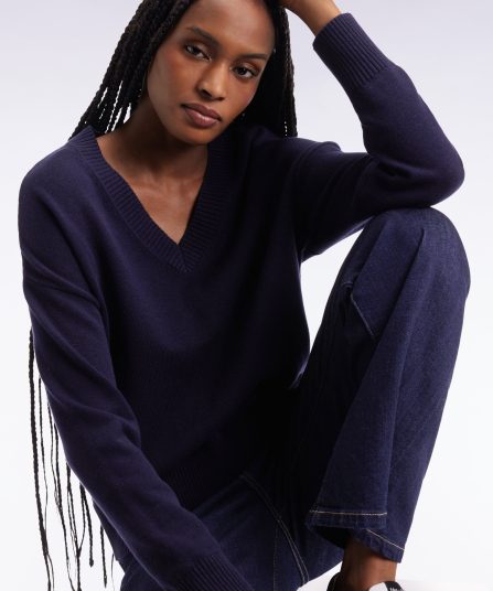 Pull à col V en laine et coton marine coupe Relaxed