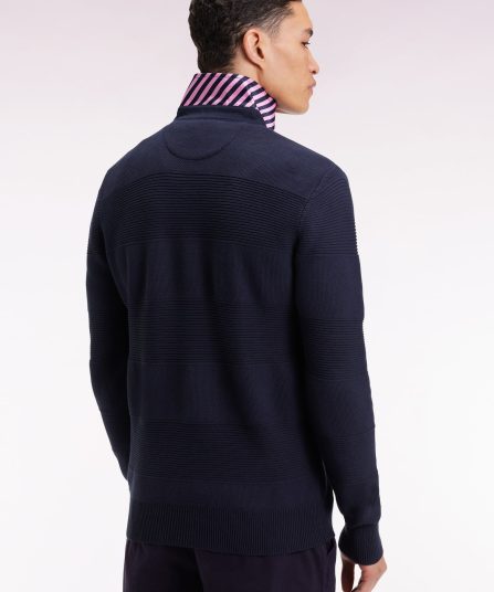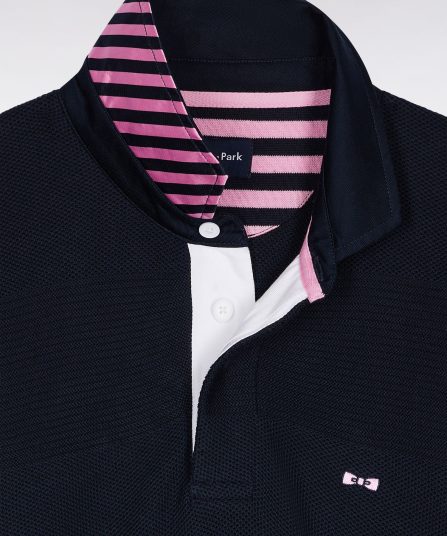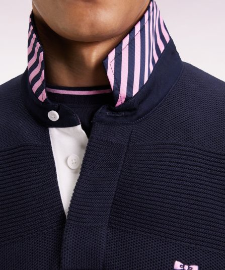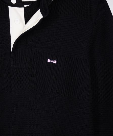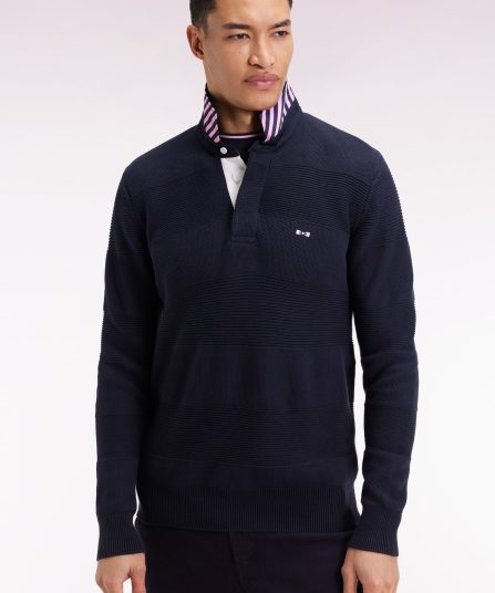 Ce pull à col maillot en coton pur revisite les codes emblématiques de notre maison française avec son tricotage double, nid d’abeille et côtes, jouant sur les textures pour recréer les rayures rugby en ton sur ton. Le dessous de col contrasté en tissu cravate rayé apporte à ce modèle sport-chic une touche d’audace, signature French Flair d’Eden Park. Coupe droite confortable, broderie nœud papillon rose sur la poitrine et finitions soignées complètent cette pièce élégante, pensée pour les plus exigeants