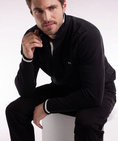 Hommage assumé à l’univers rugby, ce pull à col maillot joue sur les codes sport-chic chers à Eden Park. Dessous de col tricoté souligné d’un liseré, construction soignée avec bande de propreté en tissu cravate, rappel de sa broderie 10 sur la manche : chaque détail reflète le savoir-faire de la maison et l’amour porté au rugby. Ce pull présente une alternance de points de tricotage sur le corps et les manches pour une silhouette graphique et dynamique