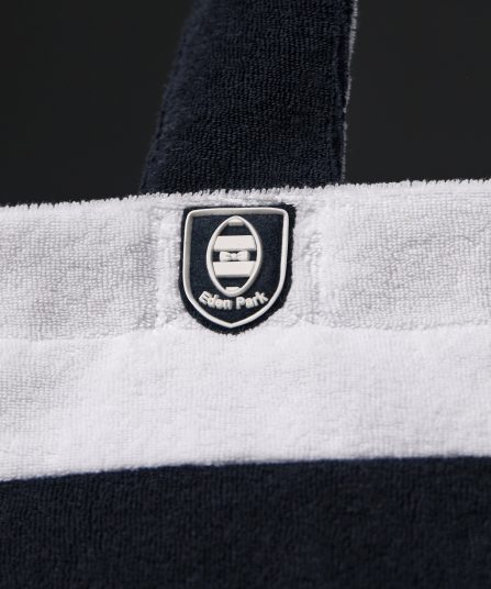 Ce tote bag exclusif a été intégralement imaginé et confectionné à partir de pièces emblématiques de notre Maison sélectionnées dans nos archives féminines. Deux maillots femme en éponge, l’un bleu marine et l’autre blanc, ont été découpés à la main puis assemblés pour former de larges rayures, clin d’œil à l’esthétique graphique de nos collections de mode. Pour la doublure, notre atelier a choisi une chute de tissu rayé issue elle aussi du stock dormant Eden Park, à laquelle s’ajoute une poche intérieure zippée, dont le zip provient d’une pièce historique. Chaque détail de ce cabas pratique et léger, comme son discret blason upcyclé apposé près de ses anses, illustre notre engagement à réemployer les ressources existantes pour donner naissance à un accessoire unique, à la fois fonctionnel, durable et original. Ce sac en éponge à rayures marine et blanche est disponible en un seul exemplaire dans la capsule Pap’Atelier proposée sur notre site internet pour une durée limitée. Dimensions : 35cm x 39cm
