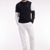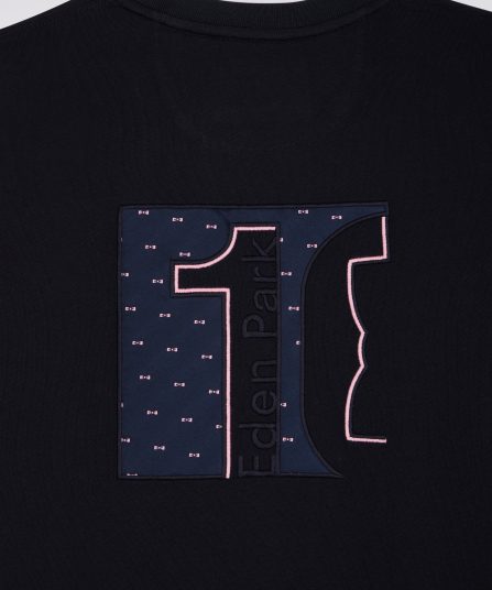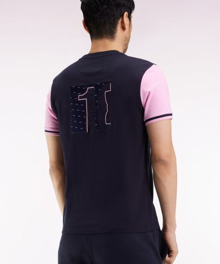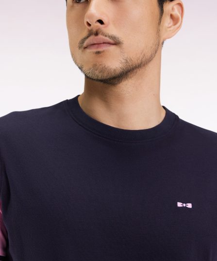 Ce T-shirt en jersey bicolore comporte des manches courtes roses soulignées par un bord en bords-côtes marine pour dynamiser la silhouette. Dans le dos, une broderie exclusive avec incrustations de tissu cravate à motifs nœuds papillon affirme le caractère distinctif de ce modèle portant fièrement les couleurs Eden Park. L’encolure en bords-côtes plats et la bande de propreté intérieure, réalisée dans le même tissu cravate imprimé, témoignent d’une attention portée aux moindres détails