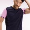 Ce T-shirt en jersey bicolore comporte des manches courtes roses soulignées par un bord en bords-côtes marine pour dynamiser la silhouette. Dans le dos, une broderie exclusive avec incrustations de tissu cravate à motifs nœuds papillon affirme le caractère distinctif de ce modèle portant fièrement les couleurs Eden Park. L’encolure en bords-côtes plats et la bande de propreté intérieure, réalisée dans le même tissu cravate imprimé, témoignent d’une attention portée aux moindres détails