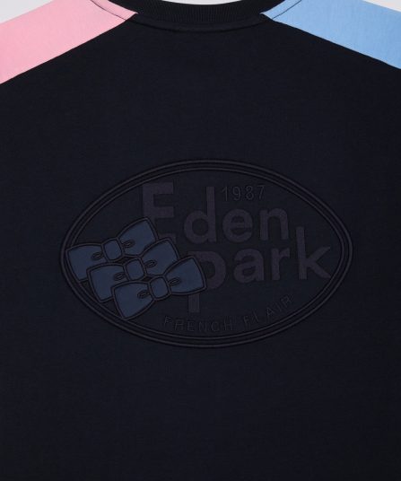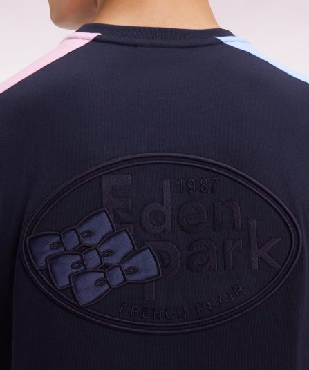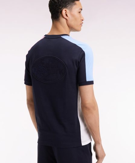 Ce T-shirt complète la ligne de vêtements masculins se distinguant par des découpes soignées dans les coloris iconiques de la maison associés au bleu marine. Une broderie dos au nom d’Eden Park soulignée d’un insert de tissu cravate cerclé parfait ce T-shirt en jersey de coton. Bordures de manches et encolure en bords-côtes tricotés garantissent confort et tenue à ce modèle unique