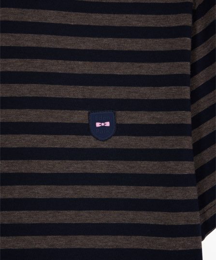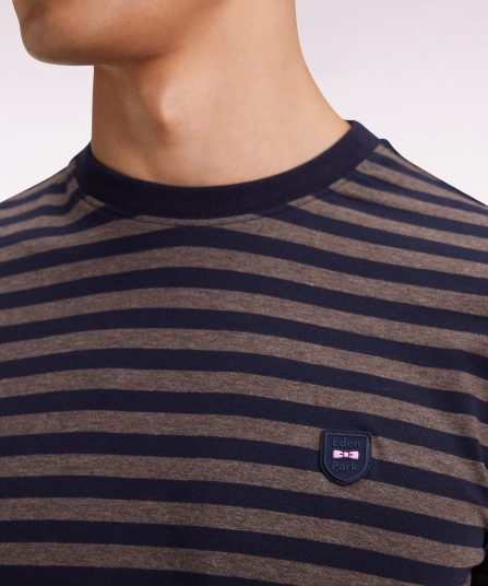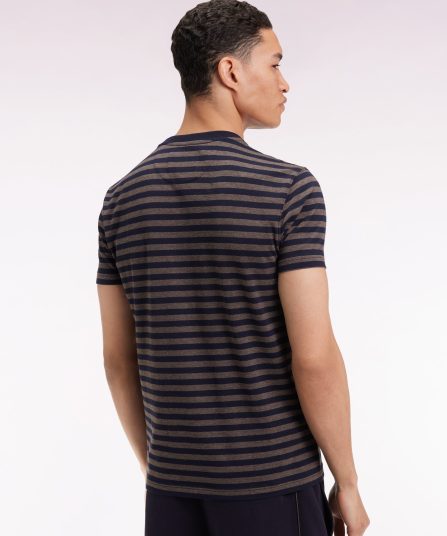 Pensé pour accompagner les mouvements avec fluidité, ce T-shirt en jersey de coton stretch revisite un essentiel du vestiaire masculin dans une version athlétique et raffinée à rayures horizontales. Sa coupe slim ajustée souligne la silhouette sans la contraindre, tandis que son col rond en bords-côtes contrastés assure une tenue durable. Un incontournable moderne doté de notre écusson signature