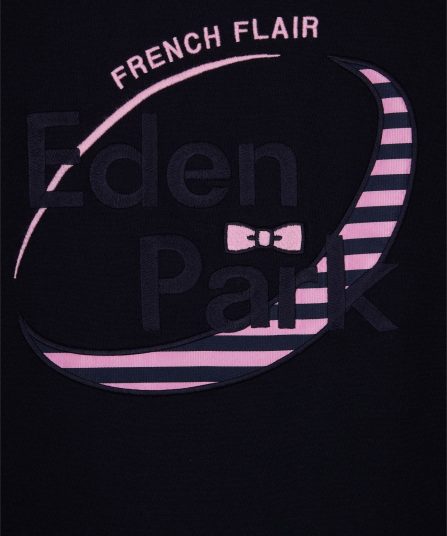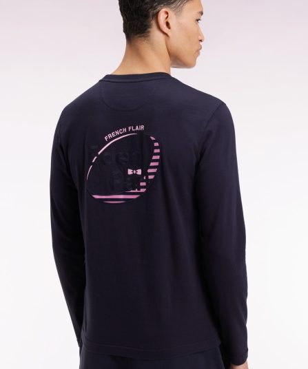 Ce T-shirt à manches longues en coton noir se distingue par ses bandes de rayures roses contrastées dans l’esprit d’une marinière revisitée. Le col rond en bords-côtes et la griffe nœud papillon brodée rappellent les codes emblématiques de notre Maison française. Une pièce intemporelle et confortable à l’allure sport chic, parfaite pour rehausser un jean ou une tenue plus urbaine. I 100 % coton