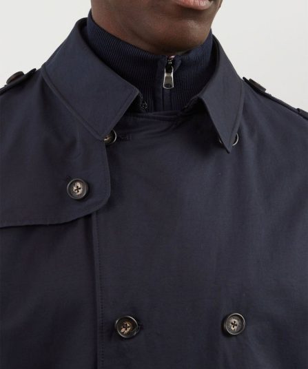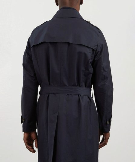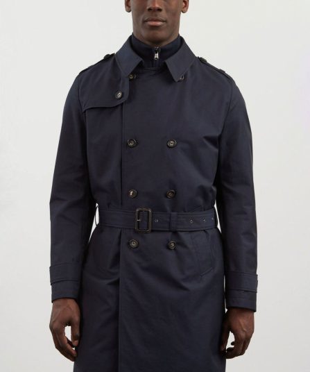 Conçu dans une matière déperlante, ce trench possède un col à pointes avec revers à détail badge logo nœud papillon pour pouvoir le porter relevé. Pourvu de poches raglan, il se ferme de façon croisée grâce à une double patte de boutonnage. La taille est ajustable par une ceinture à passants, boucle avec ardillon et oeillets brodés